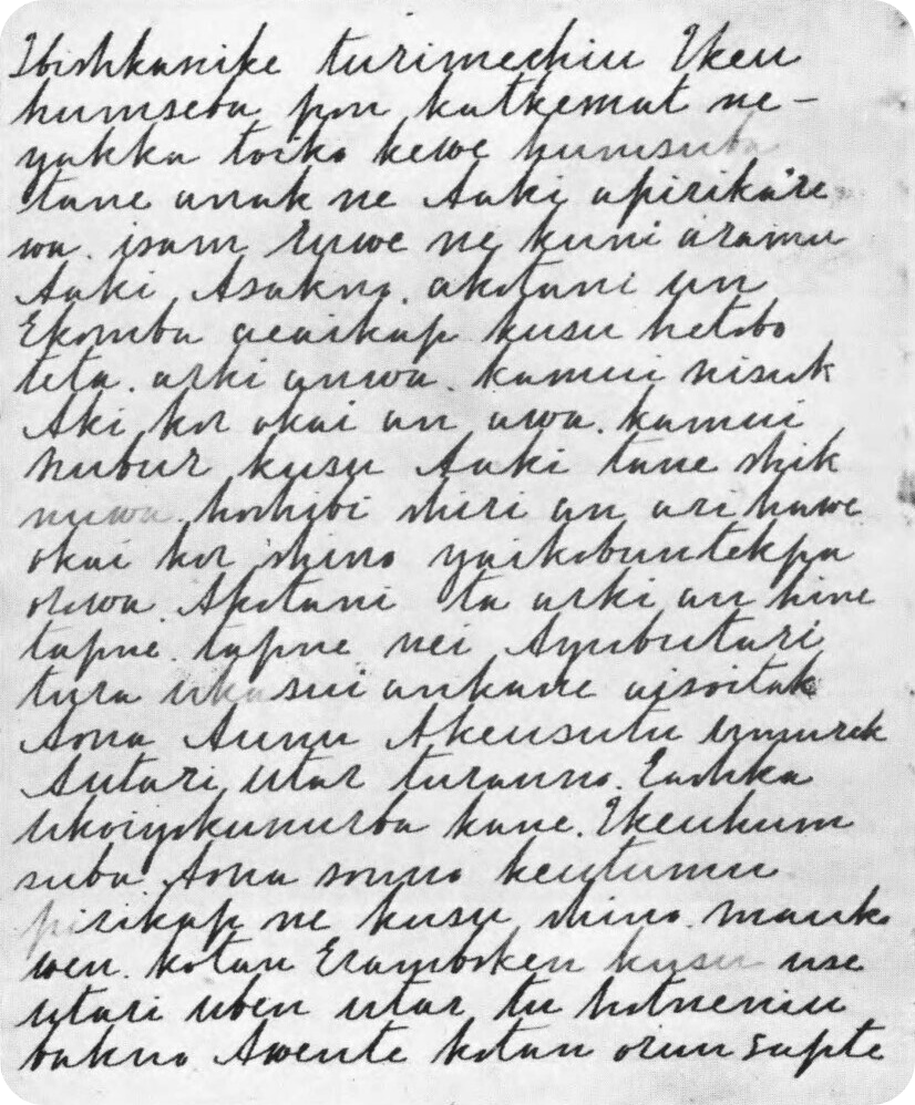 Il testo fu riportato in ainu e in giapponese per la prima volta dal già citato Kayano Shigeru, che lo ascoltò da Nabesawa Nepki (1889-1974) e lo trascrisse nel 1969. Kayano fu un instancabile attivista per la conservazione della cultura ainu: egli stesso di etnia ainu, nacque nel villaggio di Nibutani sulla costa meridionale di Hokkaidō, e fu allevato in gran parte dalla nonna che parlava quasi esclusivamente la lingua ainu. Nel 1972 fondò il Museo Ainu di Nibutani e, come Chiri Yukie, registrò molti esemplari di letteratura orale che egli stesso era in grado di recitare. Kayano fu, tra l’altro, il primo politico ainu a sedere nella Camera Alta della Dieta giapponese.